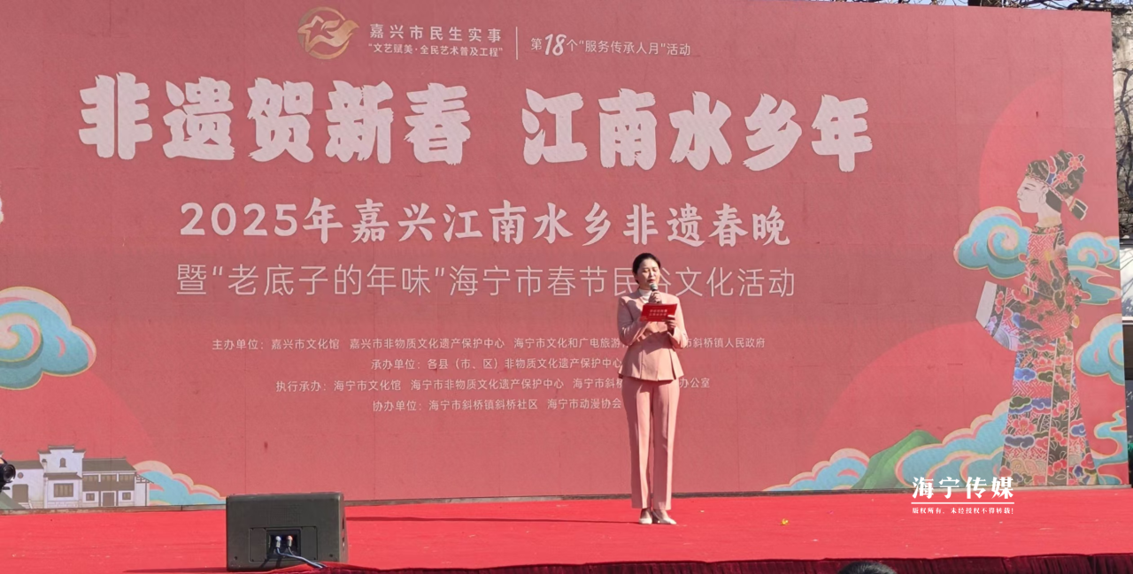 1月18日,由嘉兴市文化馆、嘉兴市非物质文化遗产保护中心、海宁市文化和广电旅游体育局、海宁市斜桥镇人民政府主办的“非遗贺新春 江南水乡年”2025年嘉兴江南水乡非遗春晚暨“老底子的年味”海宁市春节民俗文化活动在海宁市斜桥镇斜桥老街盛大启幕。